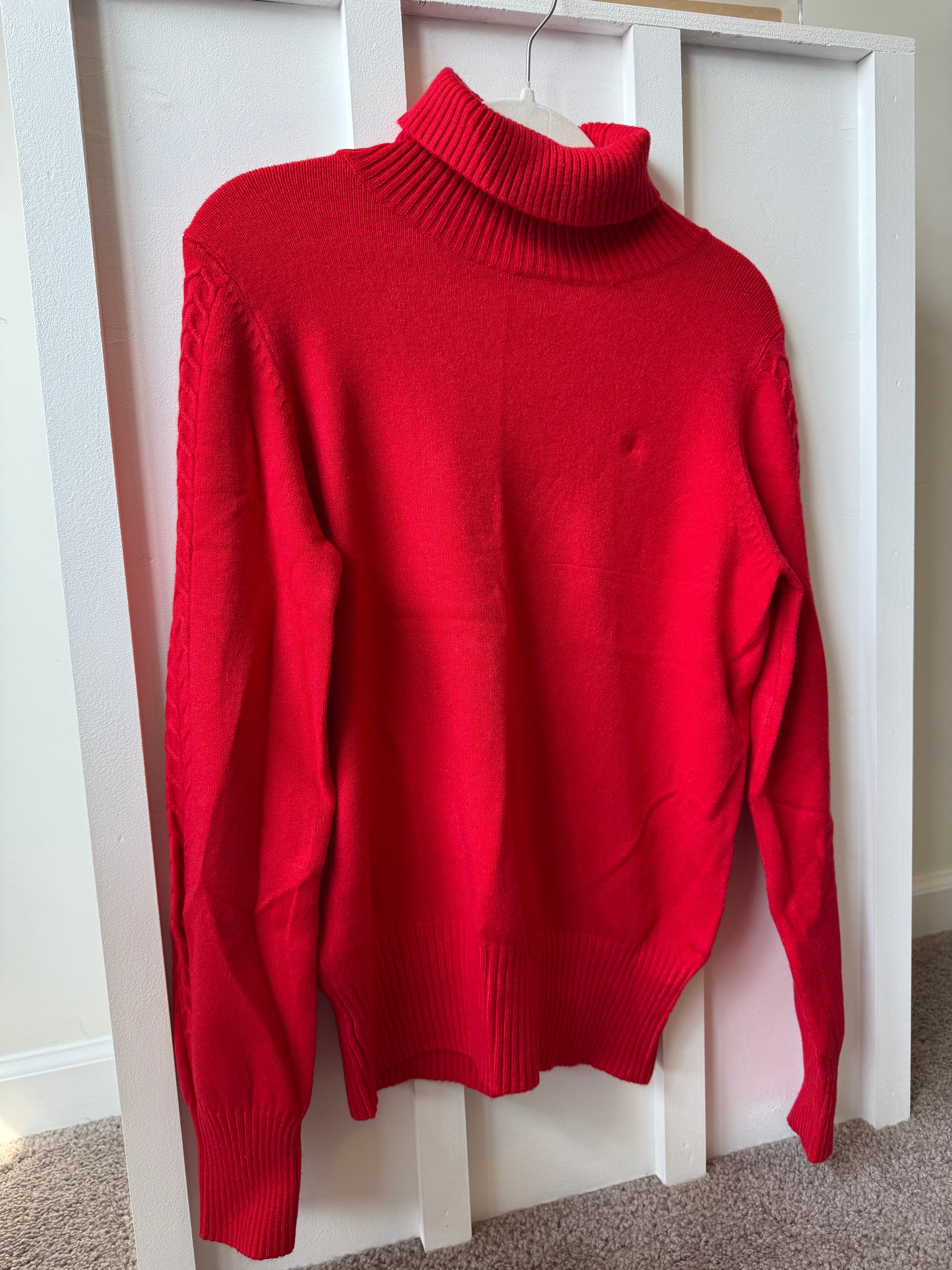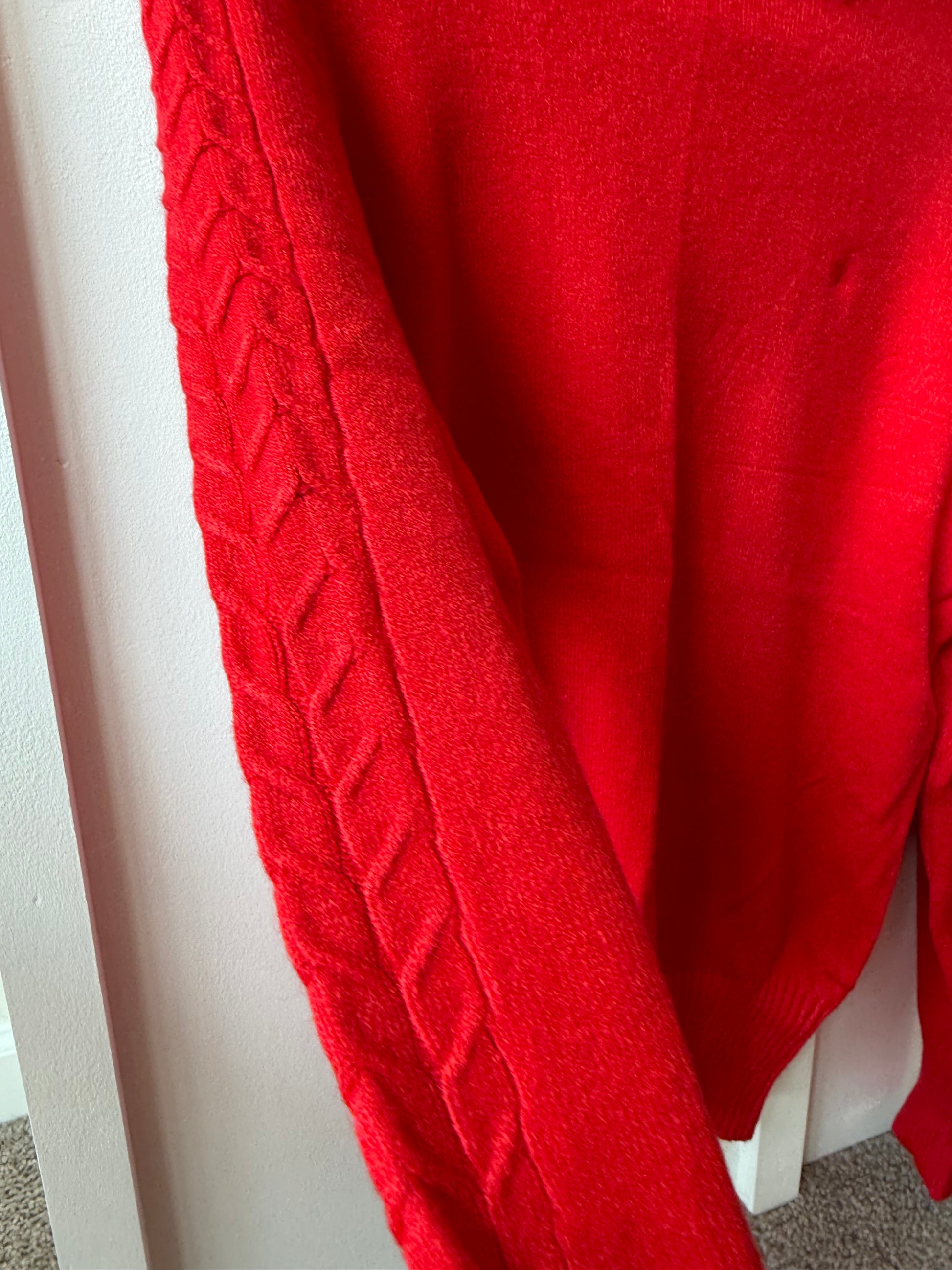 This bright cherry red knit is soft, sweet, and made for hot cocoa season.